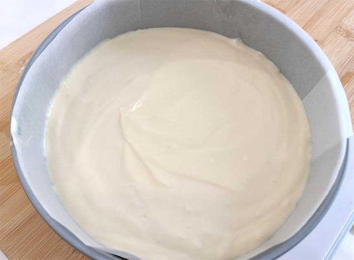 5. クッキングシートを敷いた型に生地を流し入れます。表面をなめらかに整えましょう。