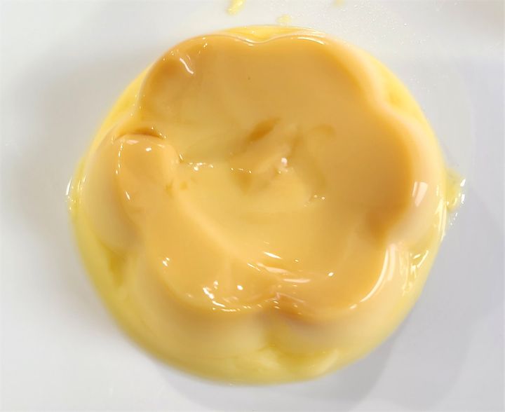 で取ったカラメルを耐熱容器に入れ、ラップをして500Wの電子レンジで30秒加熱してよく混ぜます。なめらかになったら冷蔵庫で冷やしておきます。