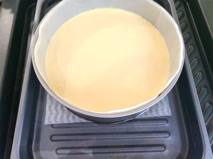 6. 天板にお湯を張り、140℃に予熱したオーブンで50分焼きます。