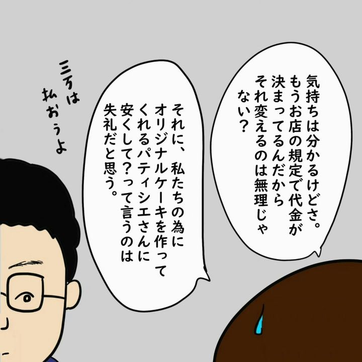 結婚式の打ち合わせで、価格交渉をし始めた夫…。予算内におさめたい気持ちは理解できますが、お店の規定で基本価格が決まっているようです。パティシエさんに対しても敬意を払いたいずんさん…。夫と意見が合いません。
