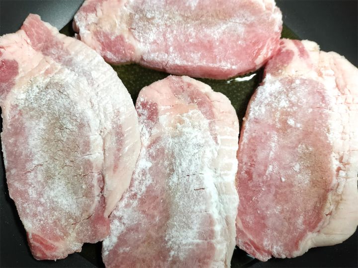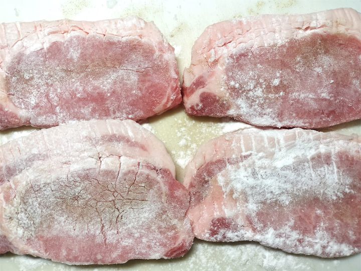 1. 豚ロースの表面に塩と白こしょうを振って、米粉をまぶします。