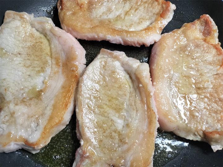 2. フライパンにオリーブオイルを引き、豚ロースを入れて焼き目がつくまで強めの中火で約2分焼きます。