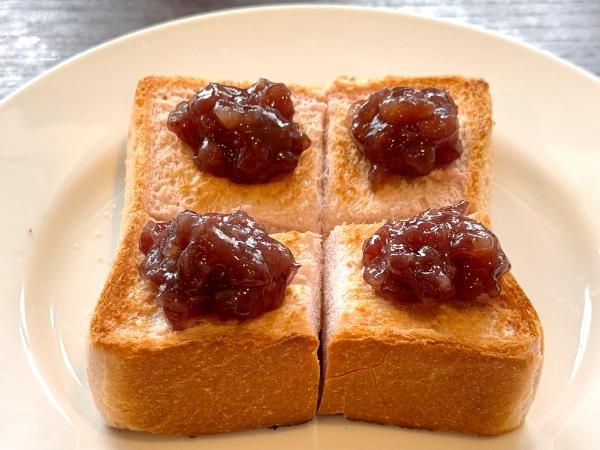 ほんのり桜色のパンに、可愛らしく盛られたあんこ。4つにカットされていて食べやすく、食パンの塩味とあんこの甘さが絶妙なバランス。最後まで美味しくいただきました。