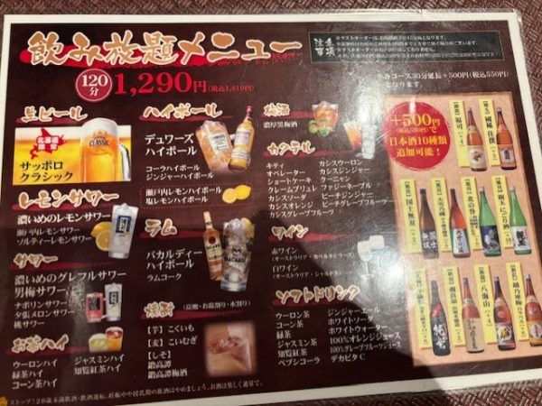 生ビール、地酒(10種類)が付いて120分飲み放題!北海道居酒屋というだけあって、サッポロクラシックや北海道の地酒も入っています。選べるドリンクは70品以上!今回は宴会料金に入っていますが、単品と合わせると1,290円で飲み放題となるようです。最初はスタッフに、2杯目以降はスマホでQRコードを読み取って注文する形式です。飲み放題終了間際にたくさん注文しやすかったです。
