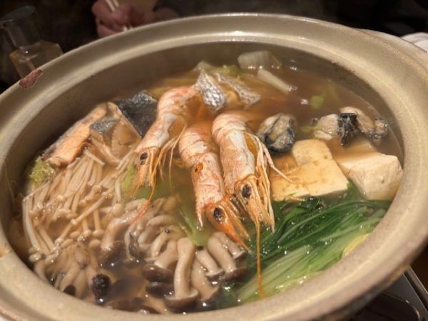 メインの鍋は、海鮮鍋か海鮮しゃぶしゃぶを選びます。海鮮鍋で。ここにも牡蠣が!エビも大きい!見えないけれど、鍋底にはアサリも入っていて、いい出汁が出ていますので〆までおいしく頂けました♪ 〆は、うどんか雑炊かを選びます。雑炊にしたので、終盤、ご飯と卵が運ばれて、セルフで作りました。
