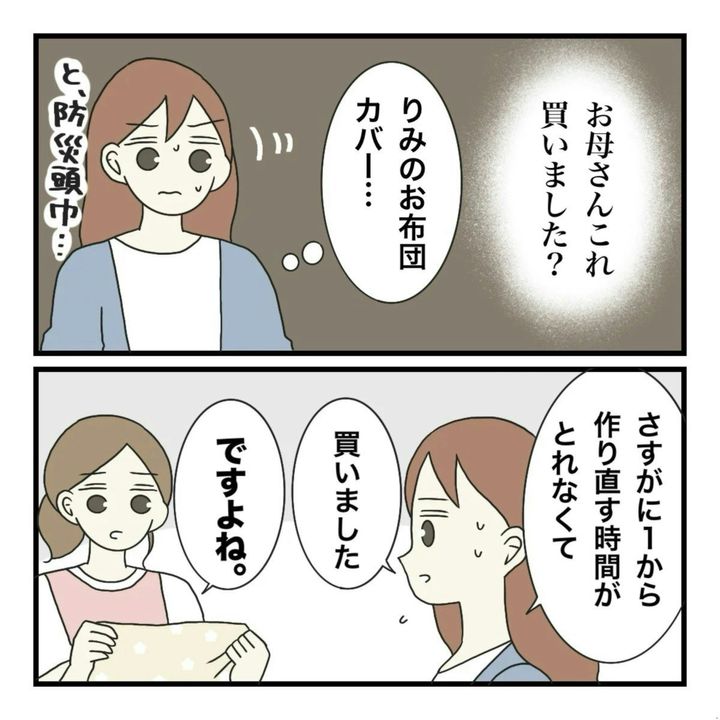 布団カバーの直しに防災頭巾の手作りまで…。さらに、園からは「なるべく早めで」とプレッシャーをかけられていたのです。そこで、まりなは既製品を購入することで、悩みを解決することに…。忙しいママにとっては既製品はとても助かりますよね。