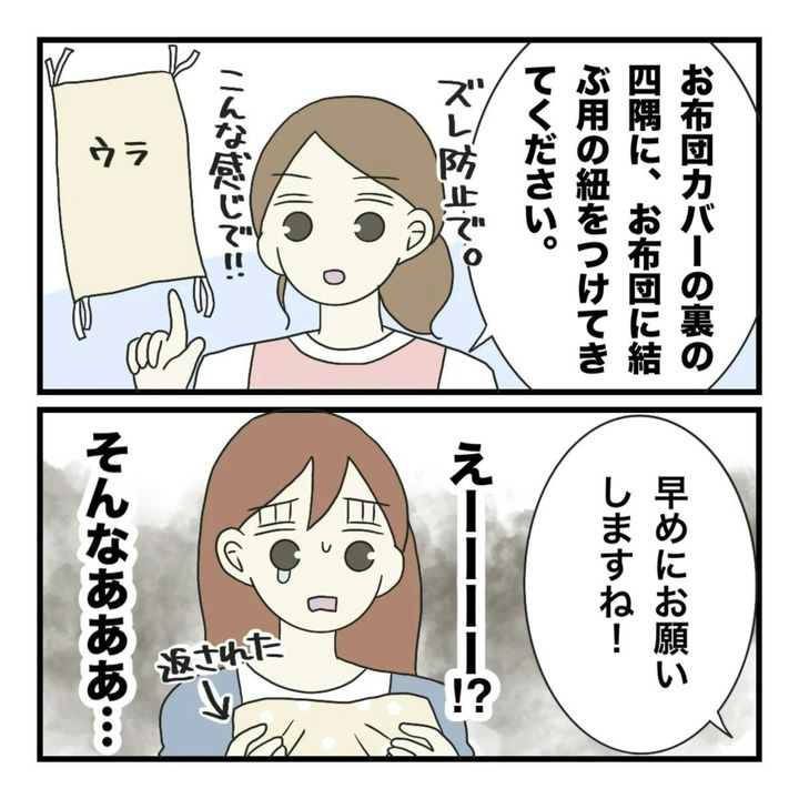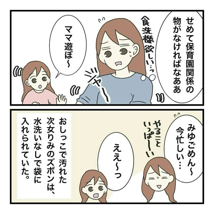 仕事から帰宅してからもやることが山積みですよね…。加えて、園で使った食器の洗い物や汚れた服の洗濯。さらに、「布団カバーのお直し」…。とてもじゃないですが、追いつきませんよね。