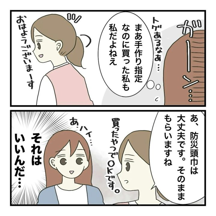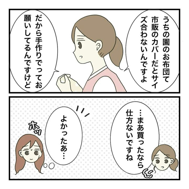 さて、買った布団カバーと防災頭巾を園へ持っていきますが、保育士の反応は?