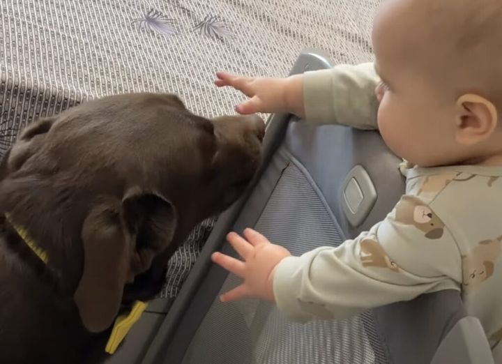 「ここ、触っていいよ」赤ちゃんに寄り添う優しい犬さん
