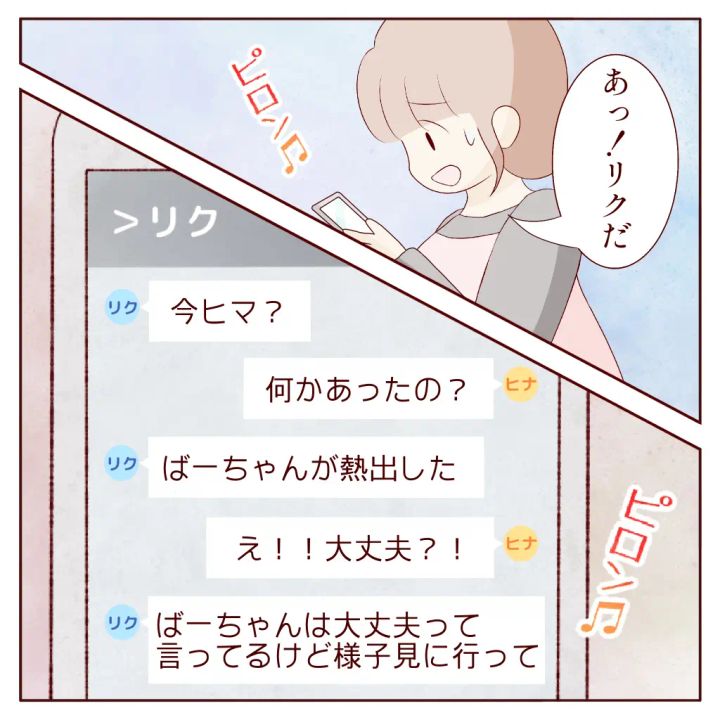 すると、「あっ!リクだ」リクさんからメッセージが!「今ヒマ?」「何かあったの?」と返信すると、「ばーちゃんが熱出した」と聞き「え!!大丈夫!?」とたずねると、「ばーちゃんは大丈夫って言ってるけど様子見に行って」と返信が。