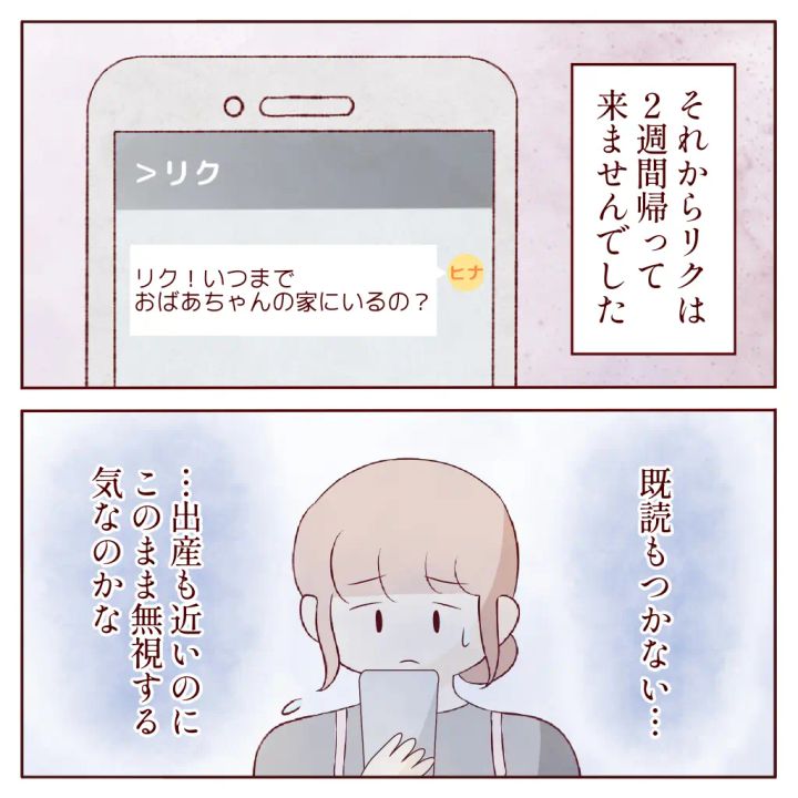 ヒナさんと口喧嘩になり、「俺ばーちゃん家で寝るわ」と家を飛び出して行ったリクさんは、それから2週間家に帰って来ませんでした。「リク!いつまでおばあちゃんの家にいるの?」ヒナさんがメッセージを送っても既読にならず、「・・出産も近いのに、このまま無視する気なのかな」と心配になるヒナさん。