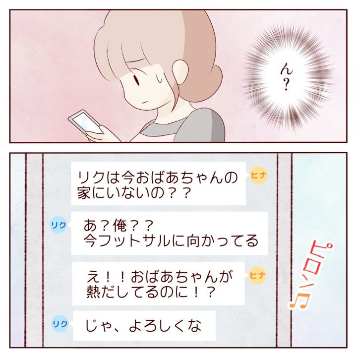 「ん?」何かがおかしいと思ったヒナさんは、「リクは今おばあちゃんの家にいないの??」と聞くと、「あ?俺??今フットサルに向かってる」と返信が!驚いて、「え!!おばあちゃんが熱出してるのに!?」とメッセージを送ると帰って来たのは「じゃ、よろしくな」という言葉だけ。