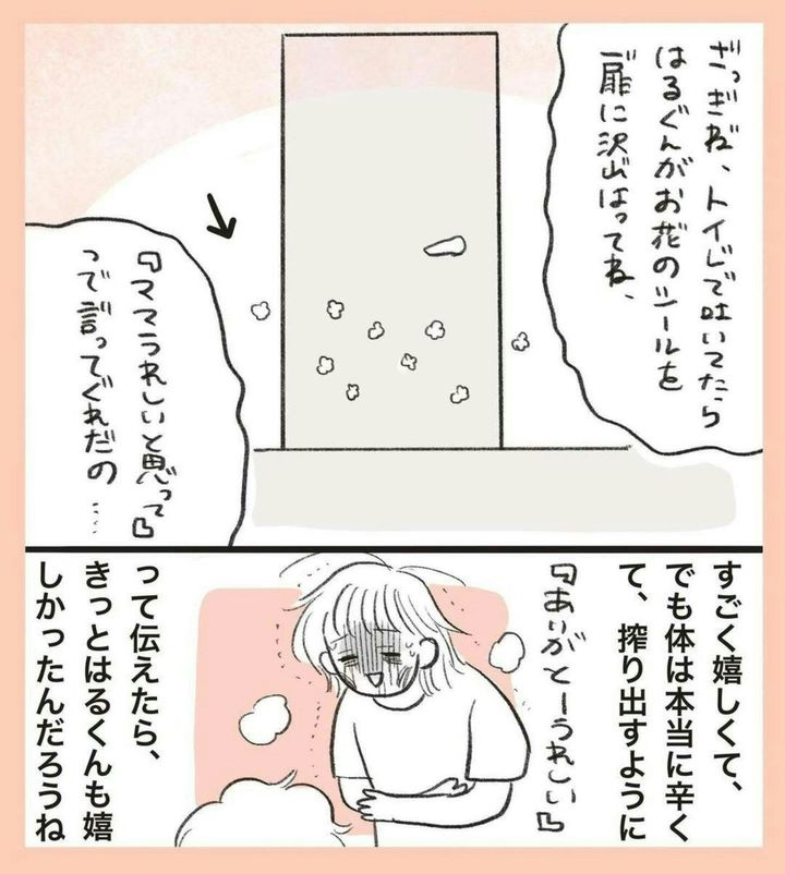 第二子を妊娠し、重いつわりに苦しむ、ほかほか命さん。心身ともにすでに限界に達していました。そんな中、息子の優しさに何度も救われてきました。