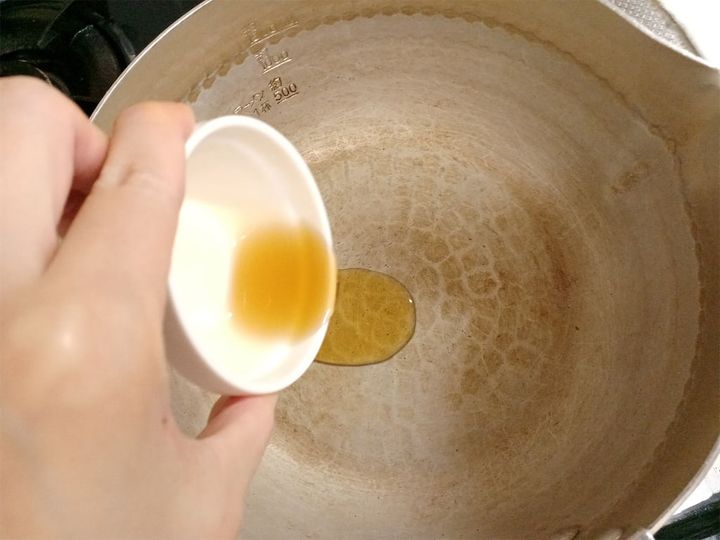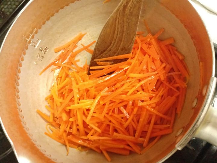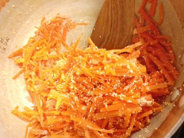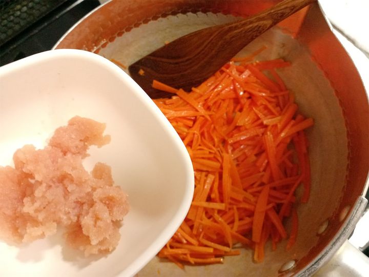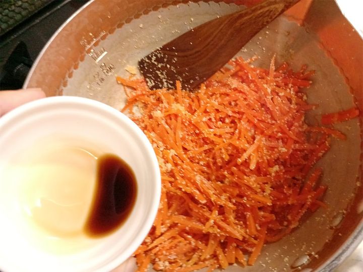 2鍋にゴマ油を引いてにんじんを炒め、みりんを入れてさらに炒める。にんじんが柔らかくなったら、たらこを入れて炒める。