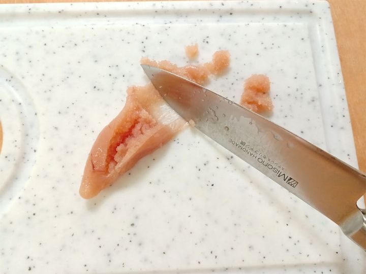 たらこは、包丁の背で皮から身を削ぎ落とします。皮は使わないので、ご飯のおかずにするなど別で召し上がってくださいね。