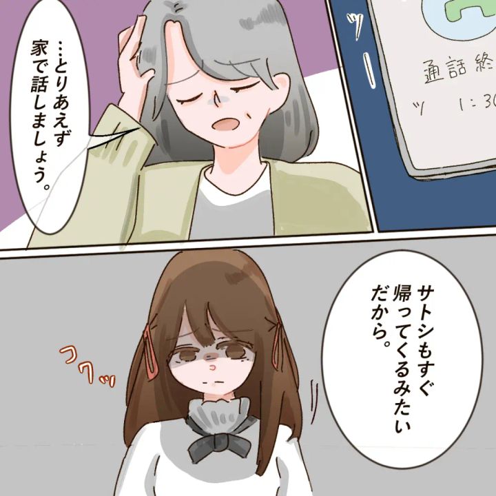 スーパーで突然「お腹には子どもがいる」「彼と離婚してください」と言われたケイコさんが、サトシさんの「今すぐ帰る」という言葉を聞き、「・・とりあえず家で話しましょう。サトシもすぐ帰ってくるみたいだから」と言うと、アイさんはうつむきながら静かに頷きました。