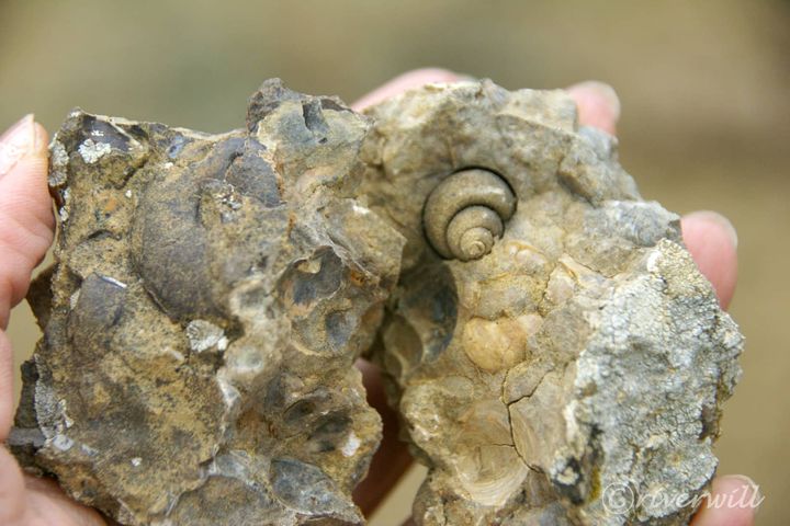 そうしたわけで、ラウンドロックの岩を割るとアンモナイトや貝殻の化石がよく埋まっています。