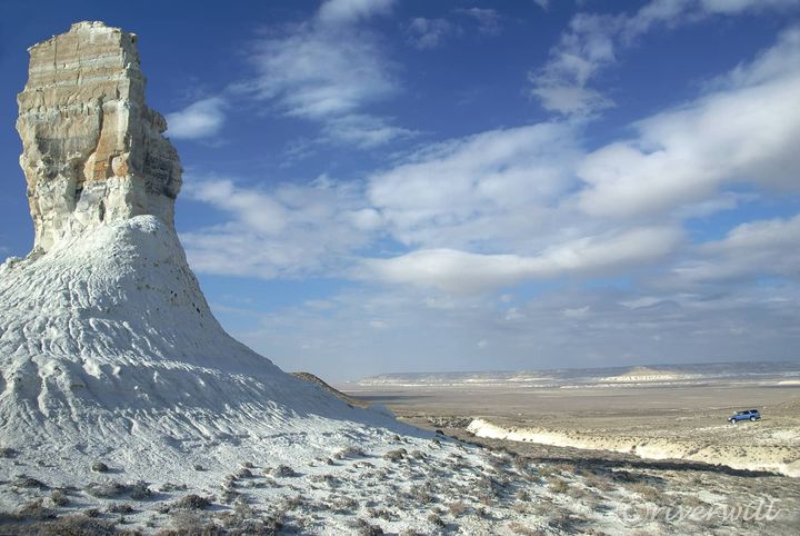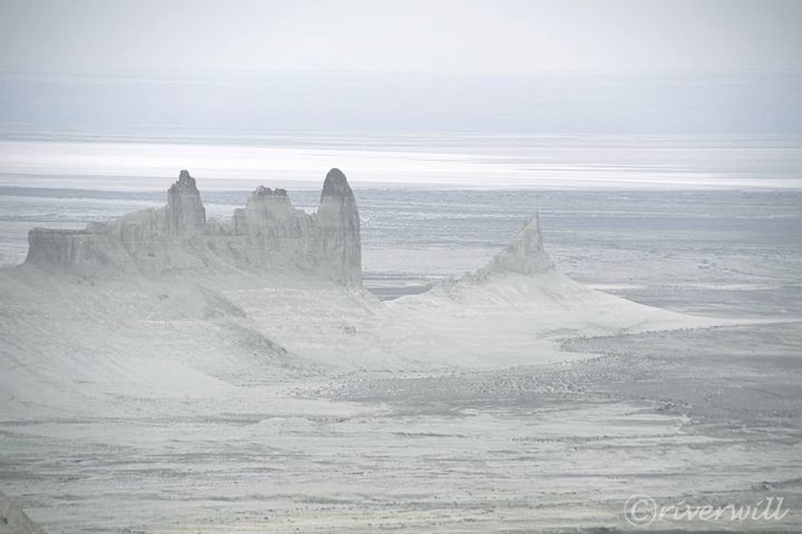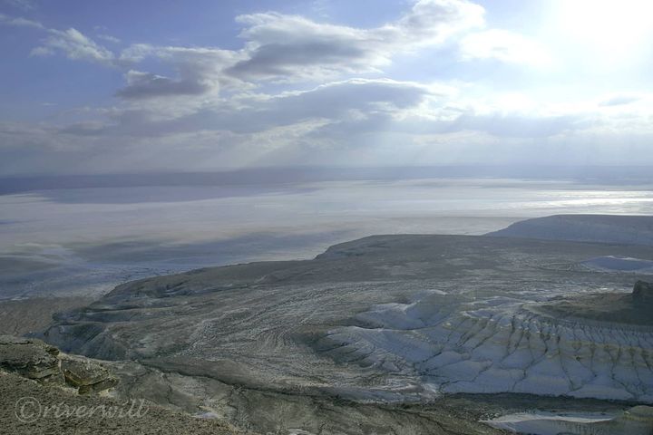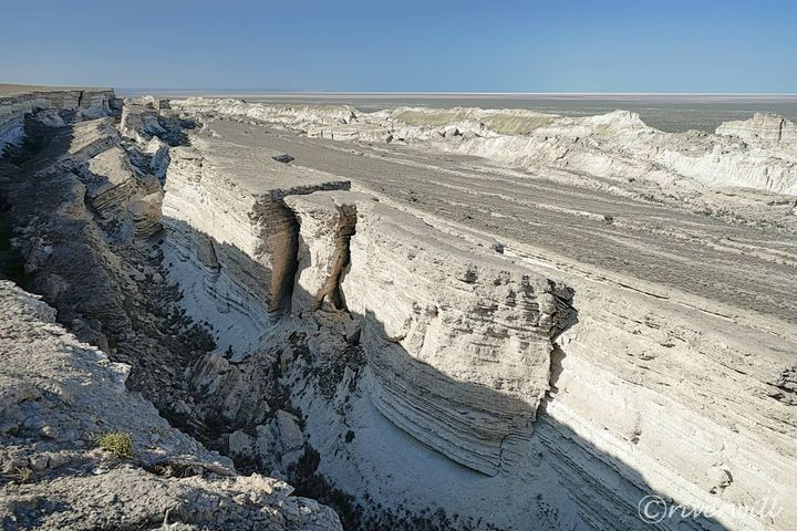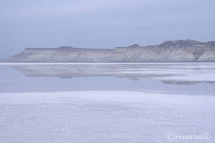 ウスチュルト台地に広がる広大な塩原「トゥズバイル塩湖」。広さ約60平方kmの湖は高さ約100m、幅10kmにおよぶ白亜の断崖に囲まれ、降雨があった後には、南米ウユニと同じく美しいリフレクションが楽しめます。
