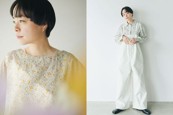花々×チェックが優美なリバティプリント。短丈×ハーフスリーブのバランスが新鮮。