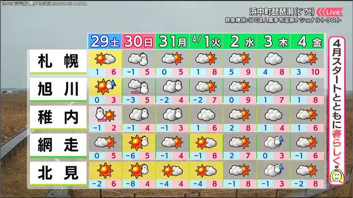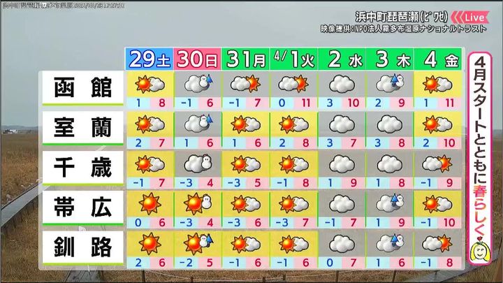 30日(日)は変わりやすい天気で、昼頃を中心に雪や風が強まるでしょう。日曜の午後から月曜にかけても道北で雪が降りますが、4月のスタートとともに少し春らしくなりそうです。