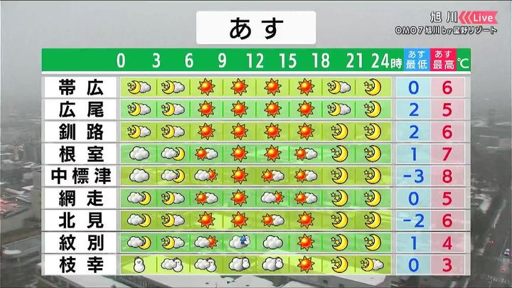 道東を中心に晴れて、日差しの温もりが感じられるでしょう。紋別は昼頃ににわか雪がある程度ですが、道北の枝幸は昼頃にかけて5~10センチの雪が降りそうです。