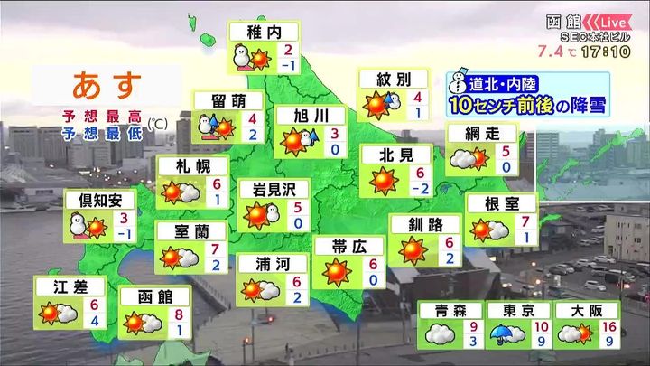 後志地方で明け方まで雪が降り、倶知安方面でうっすら積もるでしょう。札幌や函館などは朝から晴れる見込みです。日ざしの割に空気はヒンヤリします。