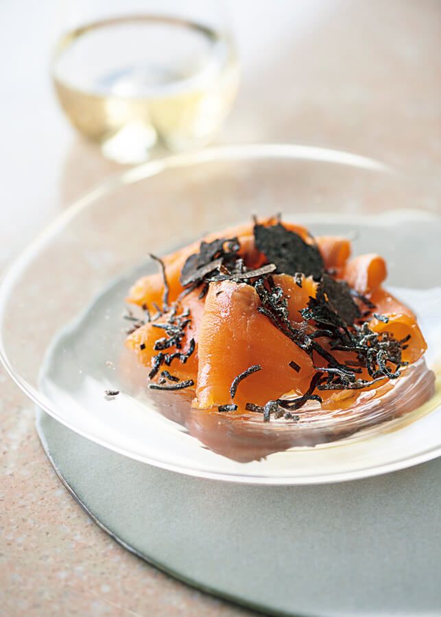 2.スモークサーモンを器に盛り、刻んだ塩昆布をかけてあれば黒トリュフも刻んで散らす。最後にトリュフオイルをかける。