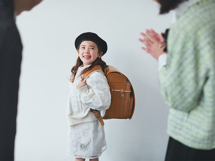 ボウタイブラウスと膝丈の黒パンツにライトグリーンのツイードジャケットを羽織ったママとオフホワイトのセットアップに黒のベレー帽とキャメルのランドセルと背負った娘とバンドカラーの白シャツにセットアップを着たパパ