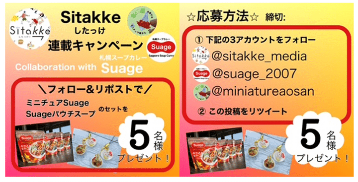 北海道を愛するミニチュア屋さん「碧ao」さんのXアカウント@miniatureaosanでは、Sitakke連載記念として「ミニチュアSuageとSuageパウチスープのセット」が抽選で5名様に当たるプレゼントキャンペーンを実施します。実施期間:3/28(金)〜4/11(金