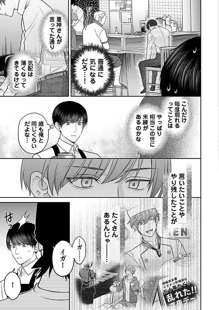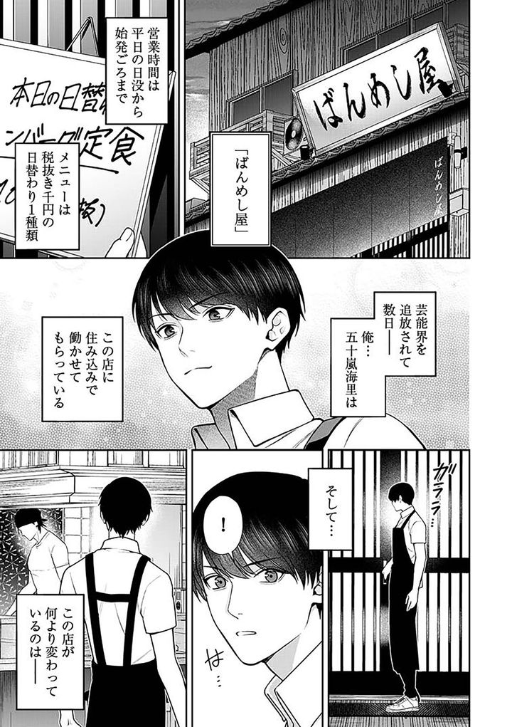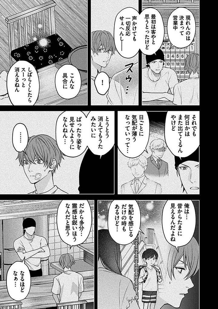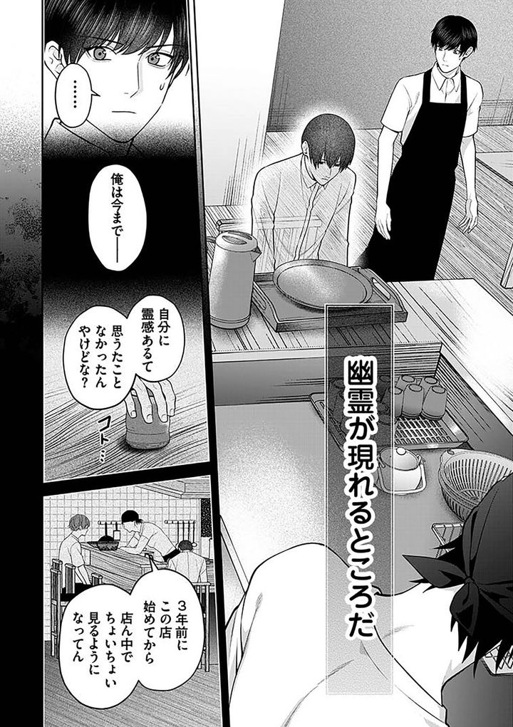自分の過去を打ち明けた五十嵐。夏神は「お疲れさん」と賄いに、生姜焼き定食を出してくれました。その美味しさに喜ぶ五十嵐。ほっとするご飯を自分では作れないと、なごんでいた矢先。五十嵐はカウンターに幽霊が座っているのを見つけて驚きます。夏神にも見えるようで…。さらに、夏神から「仕事を手伝うならここに居てもいい」と言われて…。