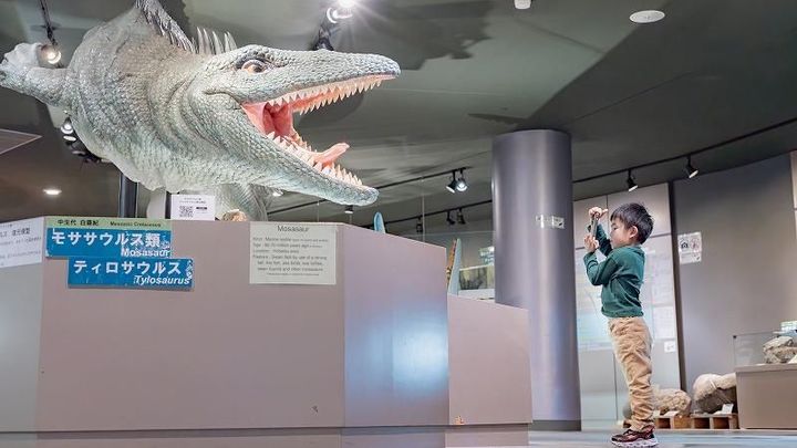 憧れのモササウルスを前に夢中でスマホカメラのシャッターを切る4歳の息子