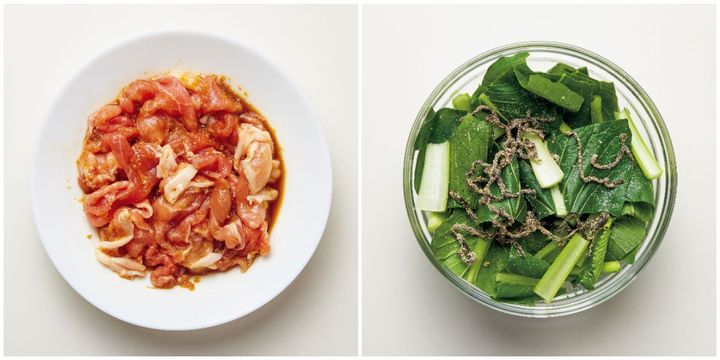『しょうが焼き』には耐熱皿(直径14.5×高さ3cm)、『小松菜の塩昆布あえ』には耐熱のボール(口径13×高さ6cm)を使用。いずれも同じサイズでなくてもOK。近い大きさのものを使って。