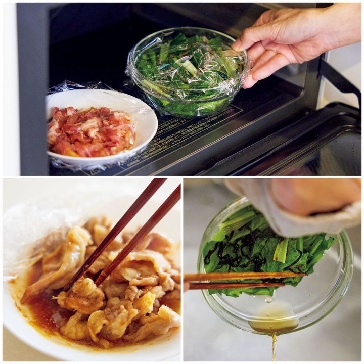 (3)(1)、(2)を電子レンジに入れ、600Wで4分加熱する。そのまま1分おいて蒸らす。豚肉は味をからめ、小松菜は水けをきって混ぜる。弁当箱におかず2品を詰め、ご飯に梅干しをのせる。