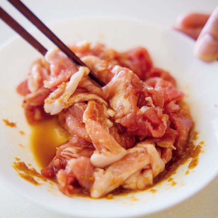 (2)耐熱皿に〈A〉を入れて混ぜ、豚肉を加えてからめる。肉を均等に広げ、ラップをふんわりとかける。