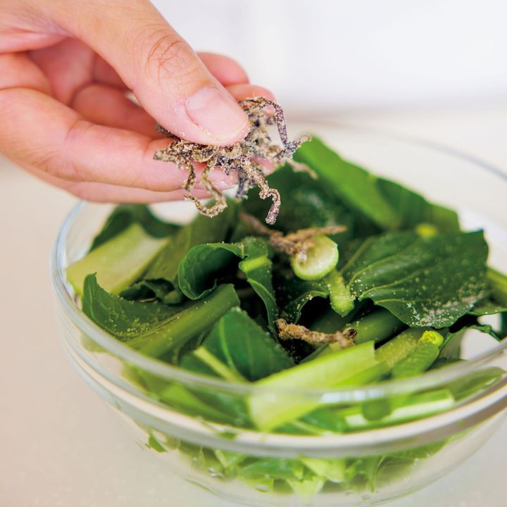 (1)小松菜は長さ3cmに切り、耐熱のボールに入れる。塩をふって塩昆布をのせ、ラップをふんわりとかける。