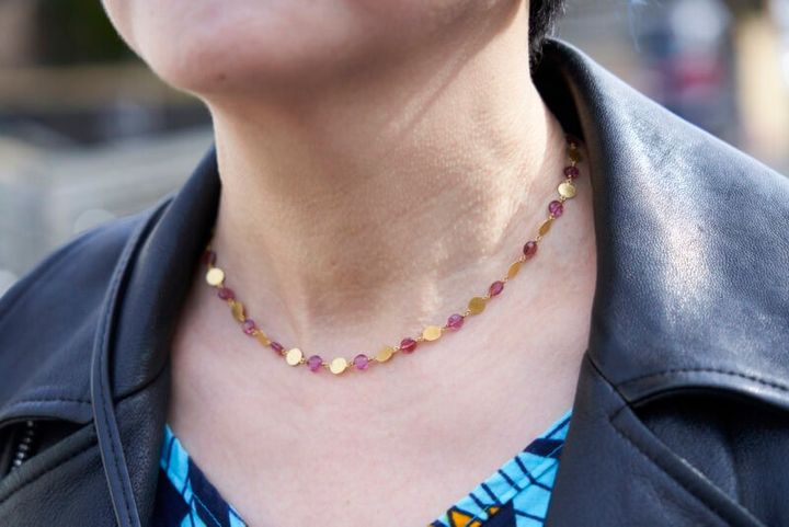 ゴールドとピンクトルマリンを交互にしたネックレスは、大人世代の首元を明るくしてくれます。クールなライダースジャケットコーデを、フェミニンな印象に変えるジュエリー使いにも注目。