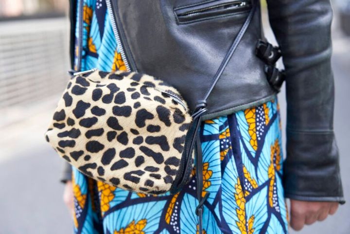 華やかワンピース×ライダースジャケットの迫力に負けないバッグは、レオパ柄のポシェット。「大相撲観戦のときは、升席(ますせき)に座ります。大きな荷物は座席に置いて、このミニポシェットだけを斜めがけにして、会場内をパトロール。有望な若手力士を見つけたり、入退場を花道まで見に行ったりします」(増田さん)