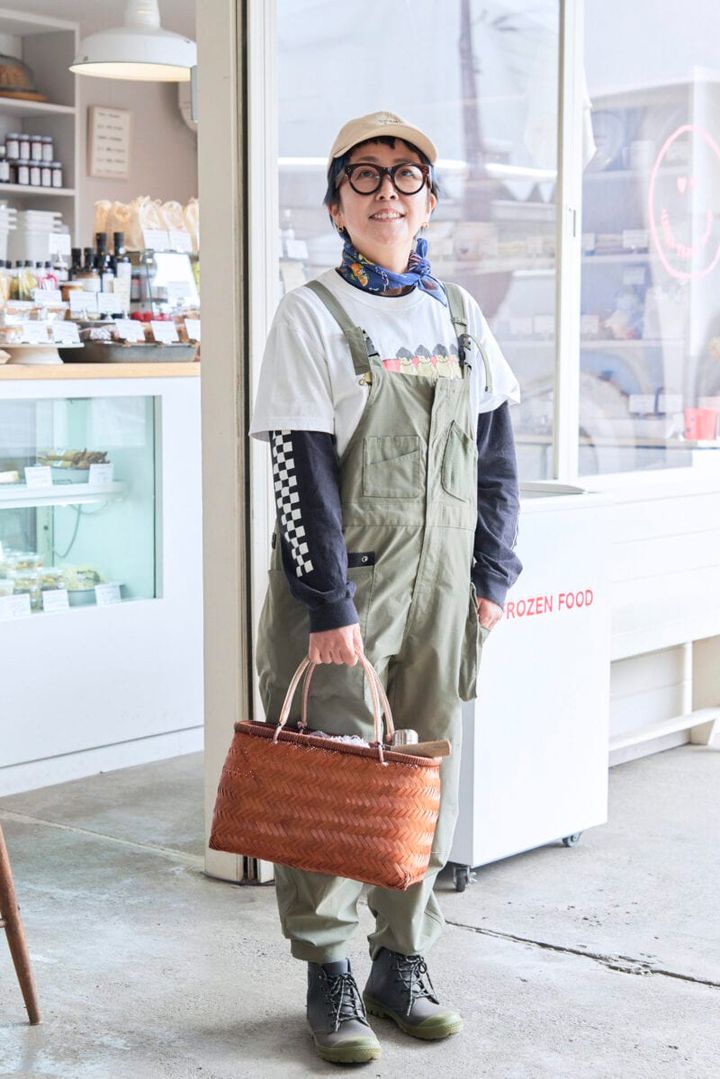 仲間8人で借りている畑で土を耕し、野菜を育てている増田さん。毎週土曜日は、サロペットパンツのファーマーズスタイルで畑へ!ごひいきの大相撲Tシャツを中に合わせて遊び心をプラス。帰りには鎌倉市農協連即売所(レンバイ)でお買い物。レンバイ内のデリショップ「ロングトラックフーズ」では、りんごのピロシキを買いました。