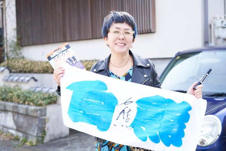 スー女の必需品。若手力士の直筆サイン入り手ぬぐいを持ってにっこり!