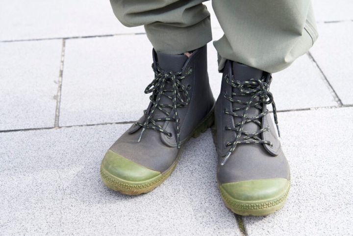 実用的な長靴も カーキグリーンでトーンを揃えて
