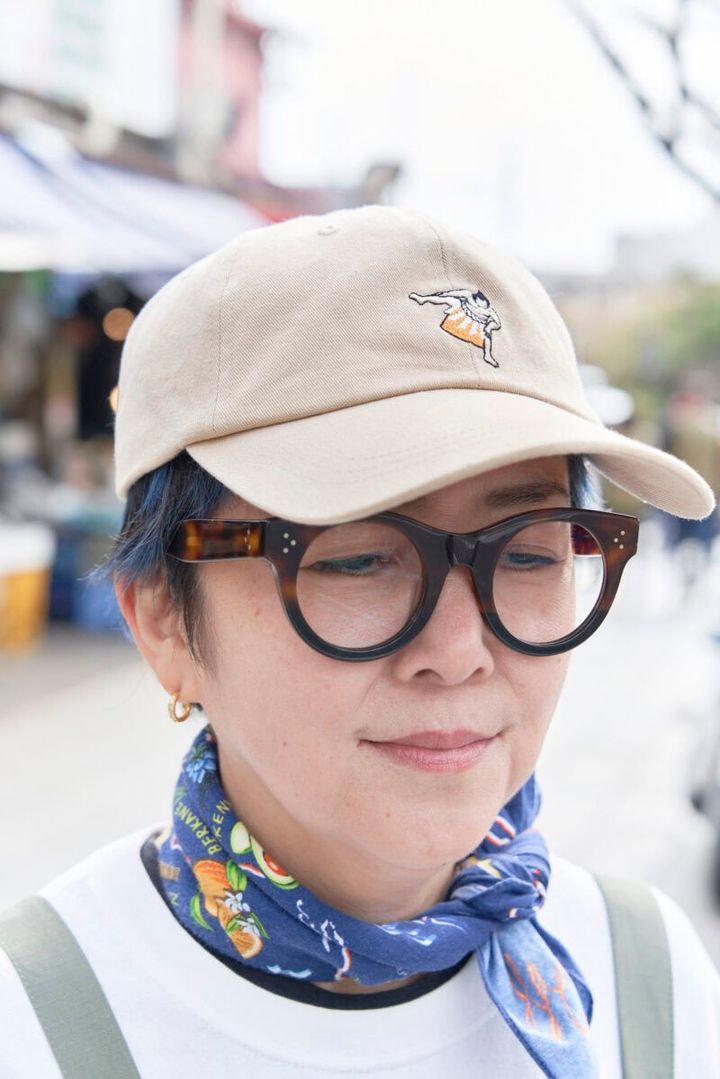 アクセサリー:相撲キャップ/ノーブランド、バンダナ/ビュリーのノベルティ、眼鏡フレーム/セリーヌ