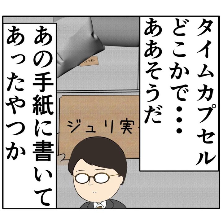 ジュリ実さんの口から出た「タイムカプセル」という言葉を聞いためが根さんは、「タイムカプセル、どこかで・・あぁそうだ。あの手紙に書いてあったやつか」と、以前読んだろみ緒さんからジュリ実さんへの手紙に書いてあったことを思い出しました。