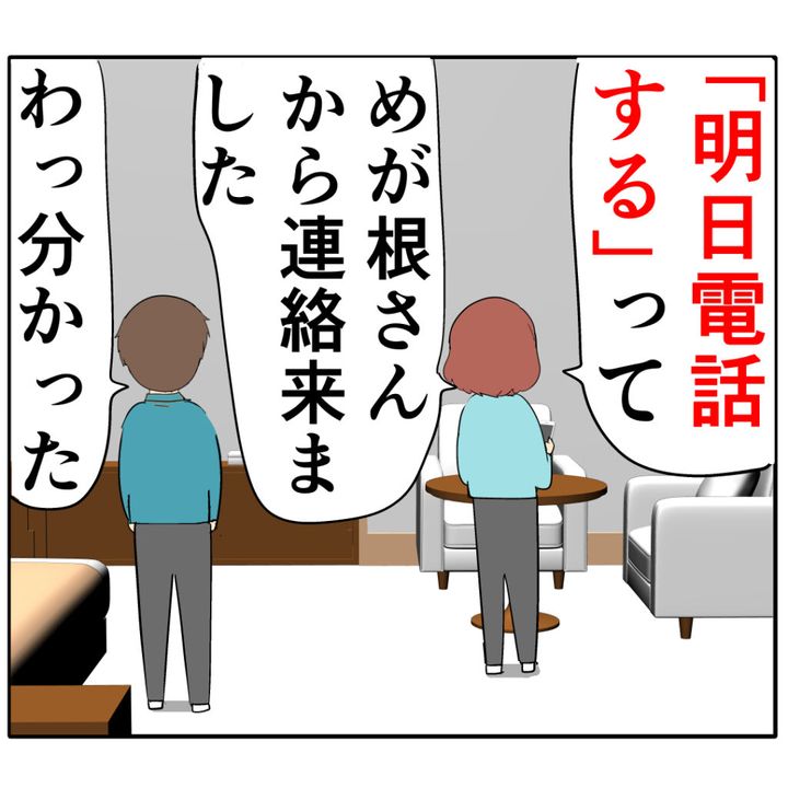 翌日の22時。予定通りめが根さんからめいさんへ電話がかかってきました。「昨日の件ですが」