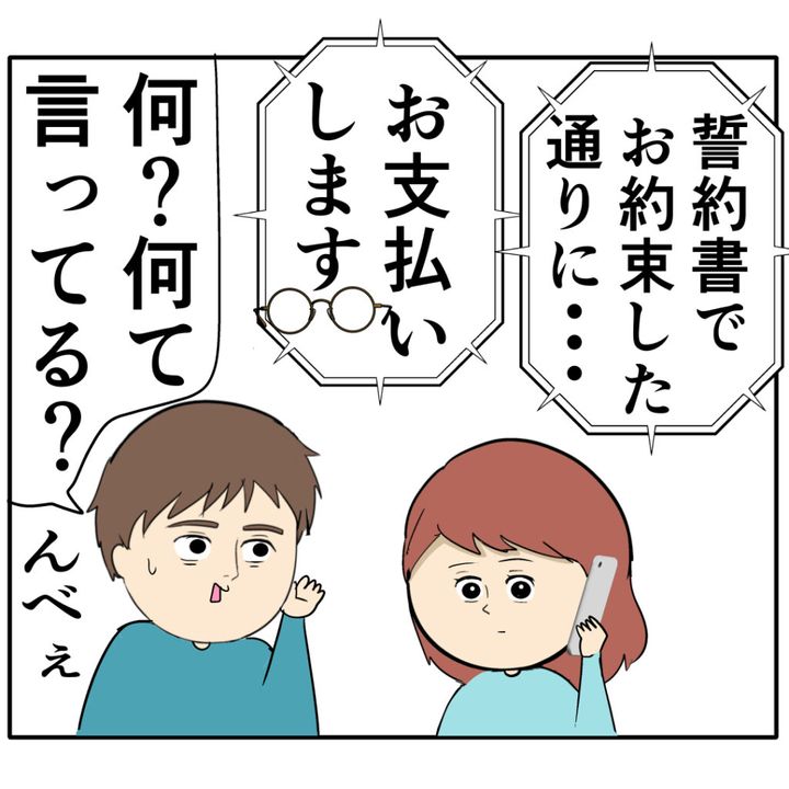 「誓約書でお約束した通りに・・お支払いします」と話すめが根さん。会話の内容が聞こえないろみ緒さんは「何?何て言ってる?」と気になります。