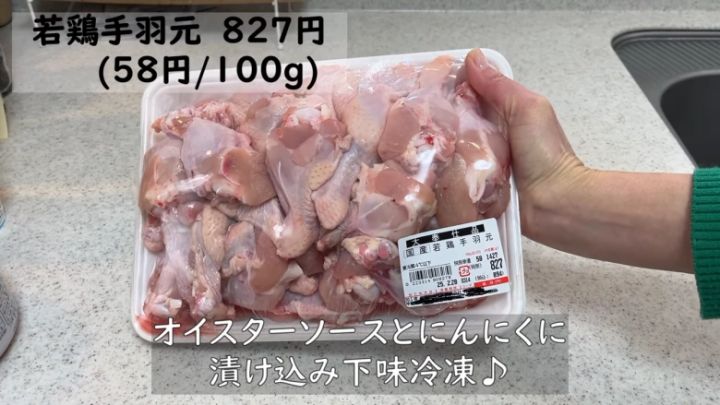 若鶏手羽元も、業務スーパーならこんなに入って1,000円でおつりがくるコスパのよさ。このなかの12本は、にんにくとオイスターソースで下味をつけて冷凍するそうです。