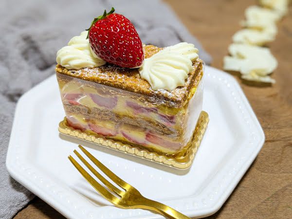 いちごのミルフィーユ。サクホロ食感のパイ生地にコクのあるカスタードクリームと甘酸っぱいいちごがよく合います。小麦の味と発酵バターの香りが広がる、贅沢なひと品でした。