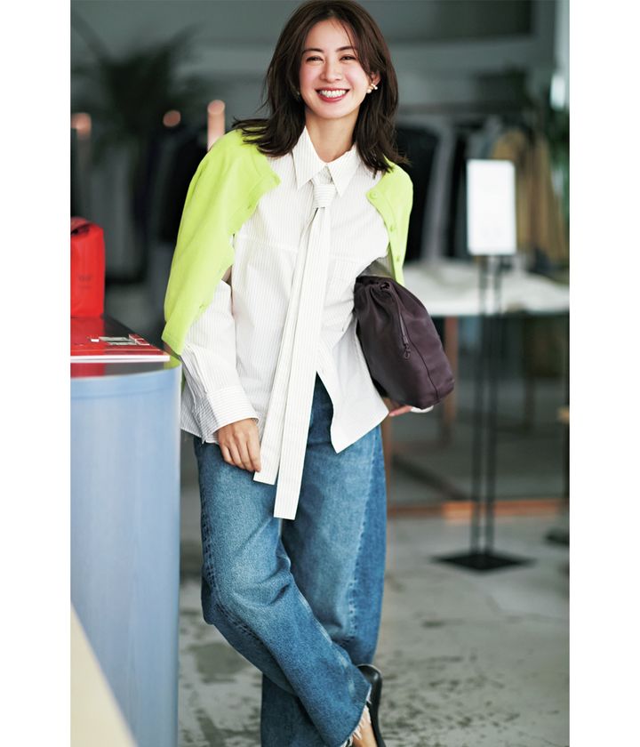 春の定番・キレイ色×デニムコーデを【タイ付きシャツ】で引き締めて