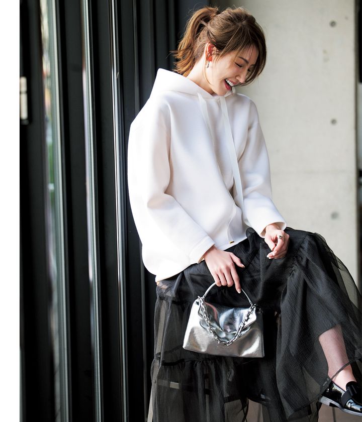 キレイめフーディ×甘スカートのスポ可愛コーデがランクイン。着心地も軽くカジュアル過ぎないボンディング素材のフーディはこれから増える春のお出かけやレジャーシーンでも活躍間違いなし。
