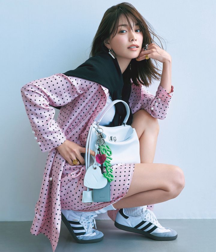 表紙コーデが読者のお気に入り第1位に! 糖度の高いピンク×ドットもシルク素材のボクシーなジャケット&スカートで大人の可愛さ。じゃらづけバッグやスニーカー合わせの攻めのスタイリングを楽しんで、「オシャレの伸びしろ」を感じる春に。