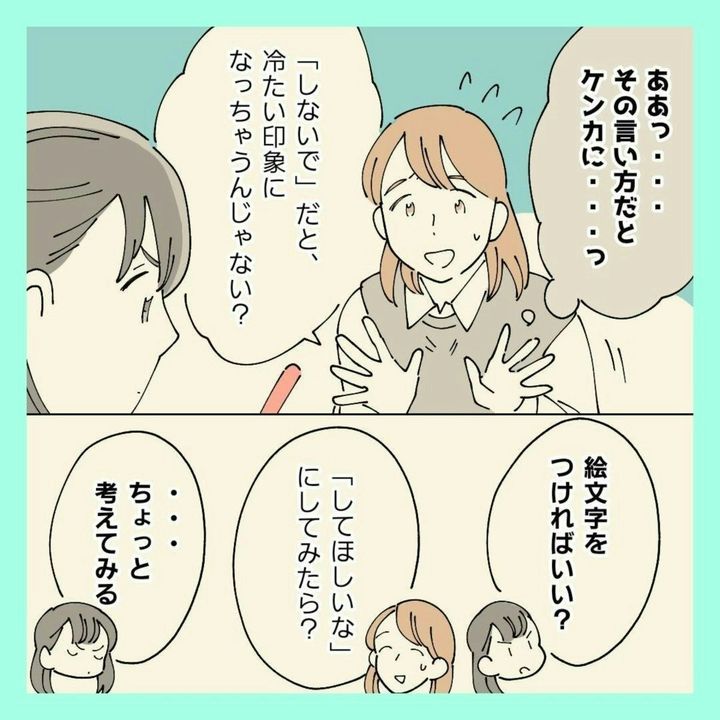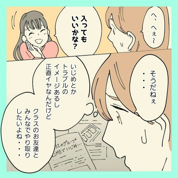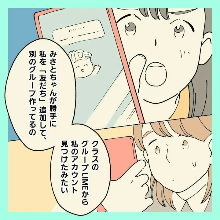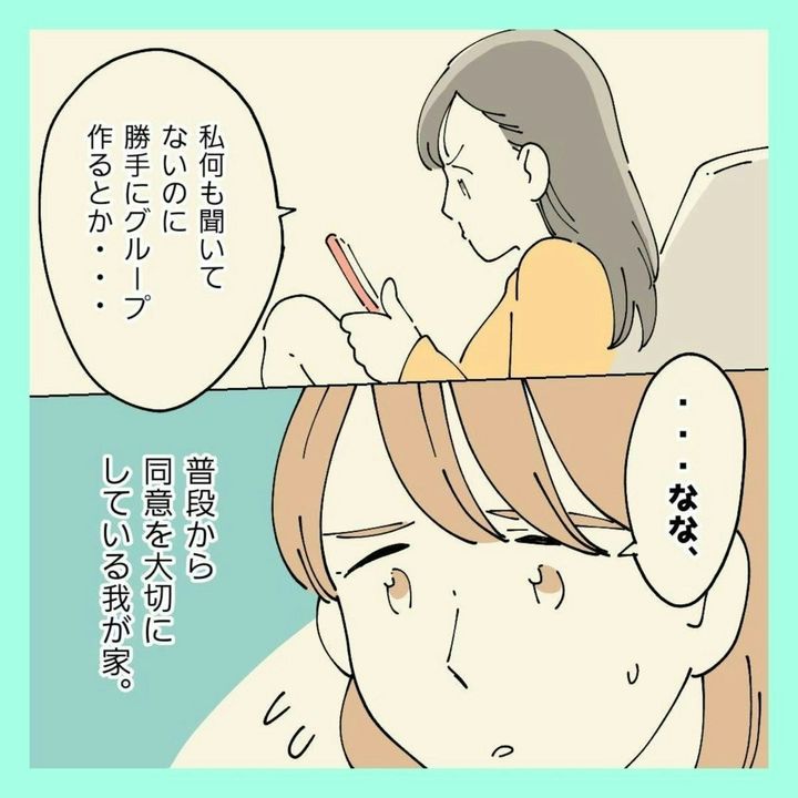 同意なく、勝手に友だち登録をされたうえに、別グループに招待された、なな。母親にも相談し、「今後は同意を得てからグループに招待してほしい」と伝えることができました。「同意を得る」ことの大切さについて、普段から両親と話し合っている様子が伝わってきますね。
